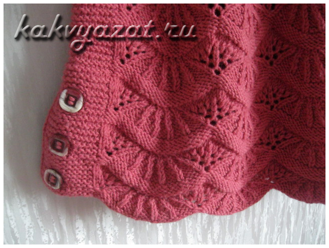 По бокам имеются вставки и виде полос платочной вязки. Внизу можно увидеть небольшие разрезы с декоративными пуговицами: